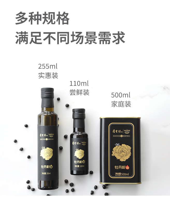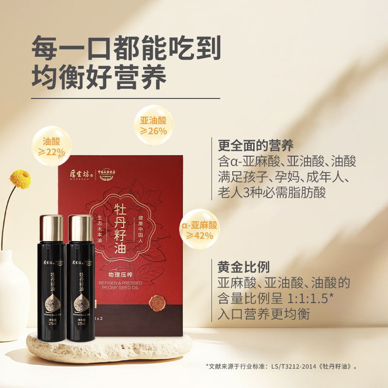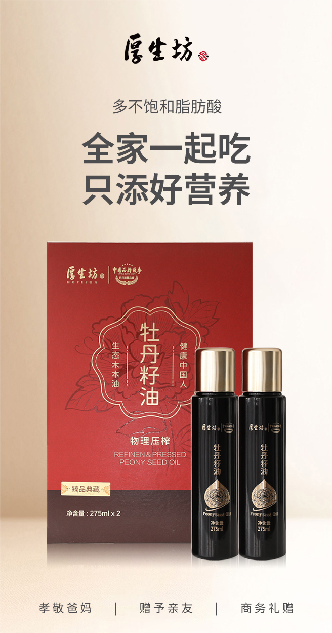 厚生坊牡丹籽油,点亮健康生活。自有种植基地,引进国际先进设备,自主种植+加工+销售三产融合,牡丹籽油不饱和脂肪酸达90%以上,保留牡丹籽纯正的天然营养,为您带来健康的滋养力量。
