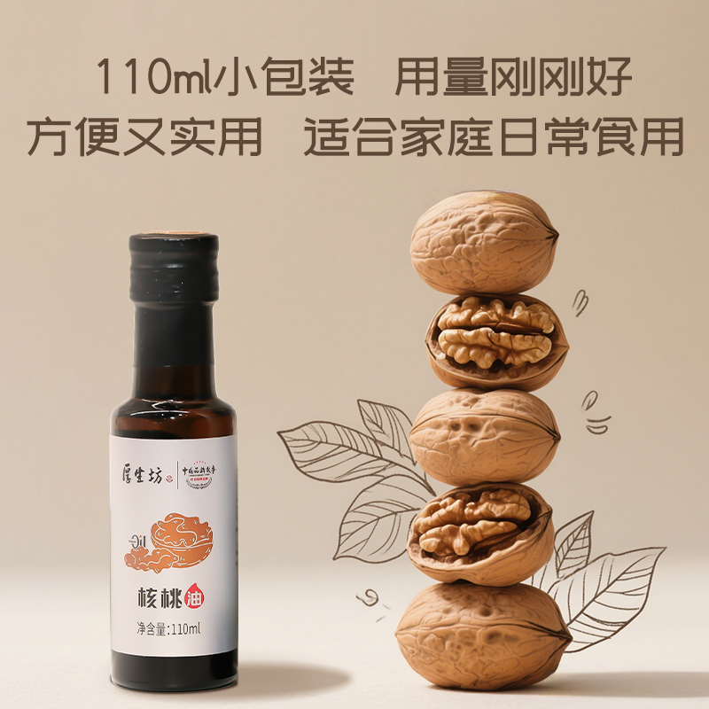 厚生坊核桃油,甄选天然优质核桃。以非凡品质,传递非凡心意。每一滴都蕴含着大自然的营养与健康,只为天然、安全、健康的产品,厚生坊核桃油,守护您的幸福生活。