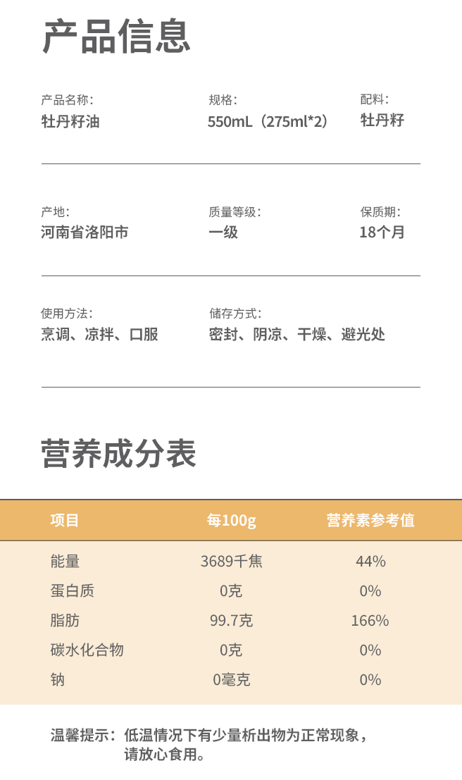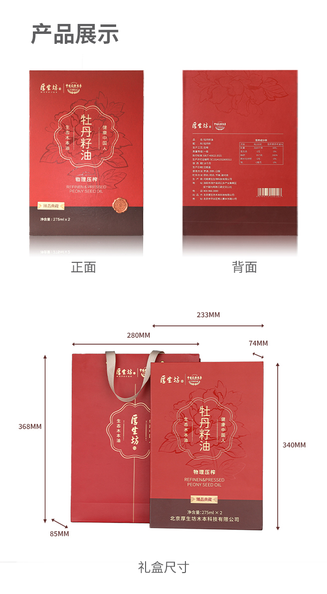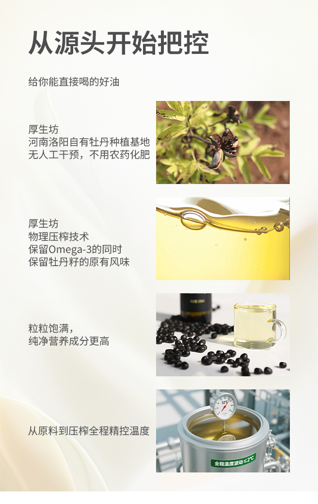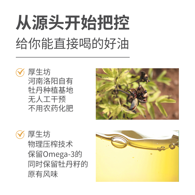 厚生坊牡丹籽油,点亮健康生活。自有种植基地,引进国际先进设备,自主种植+加工+销售三产融合,牡丹籽油不饱和脂肪酸达90%以上,保留牡丹籽纯正的天然营养,为您带来健康的滋养力量。