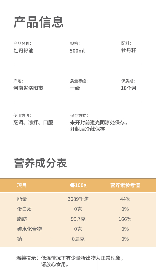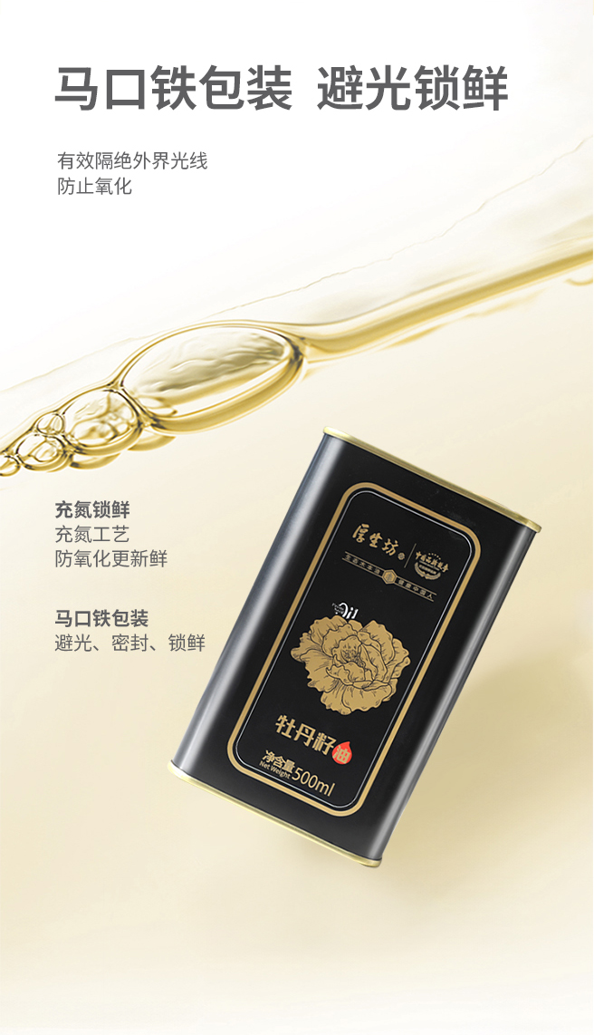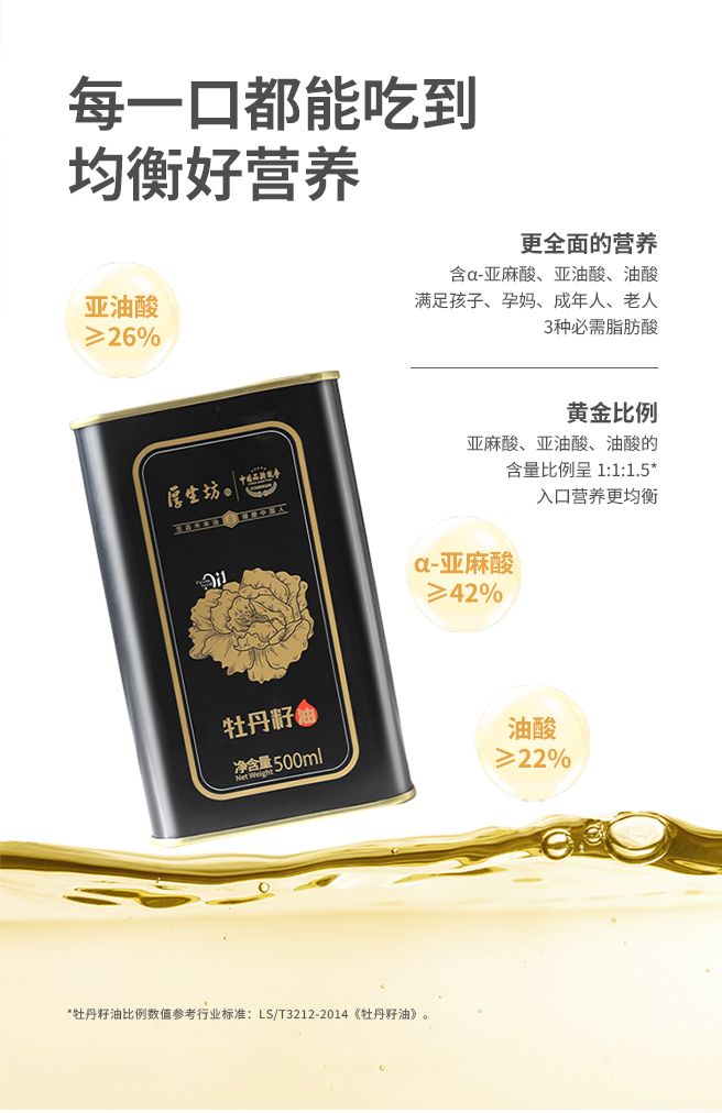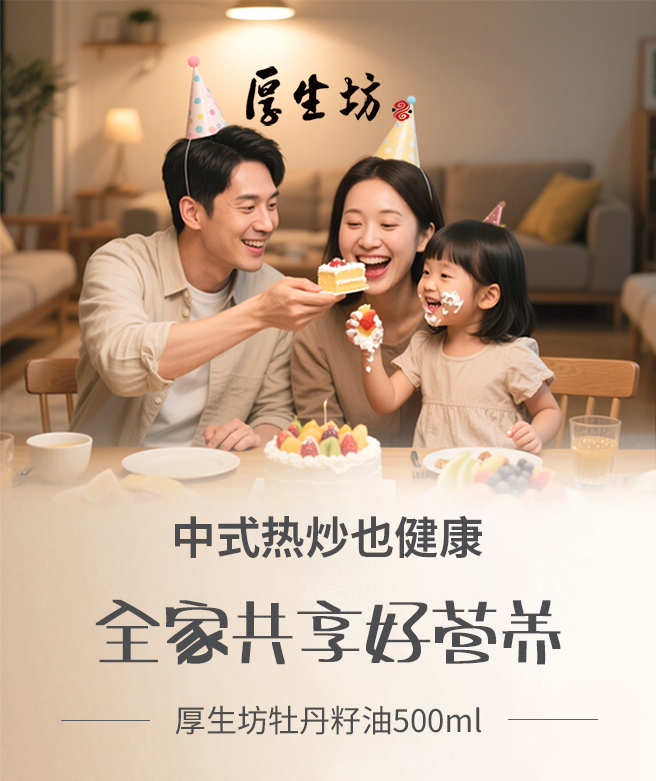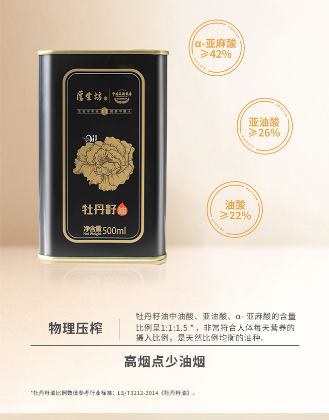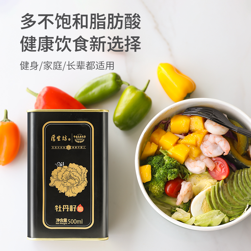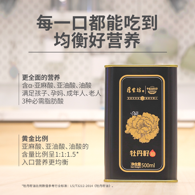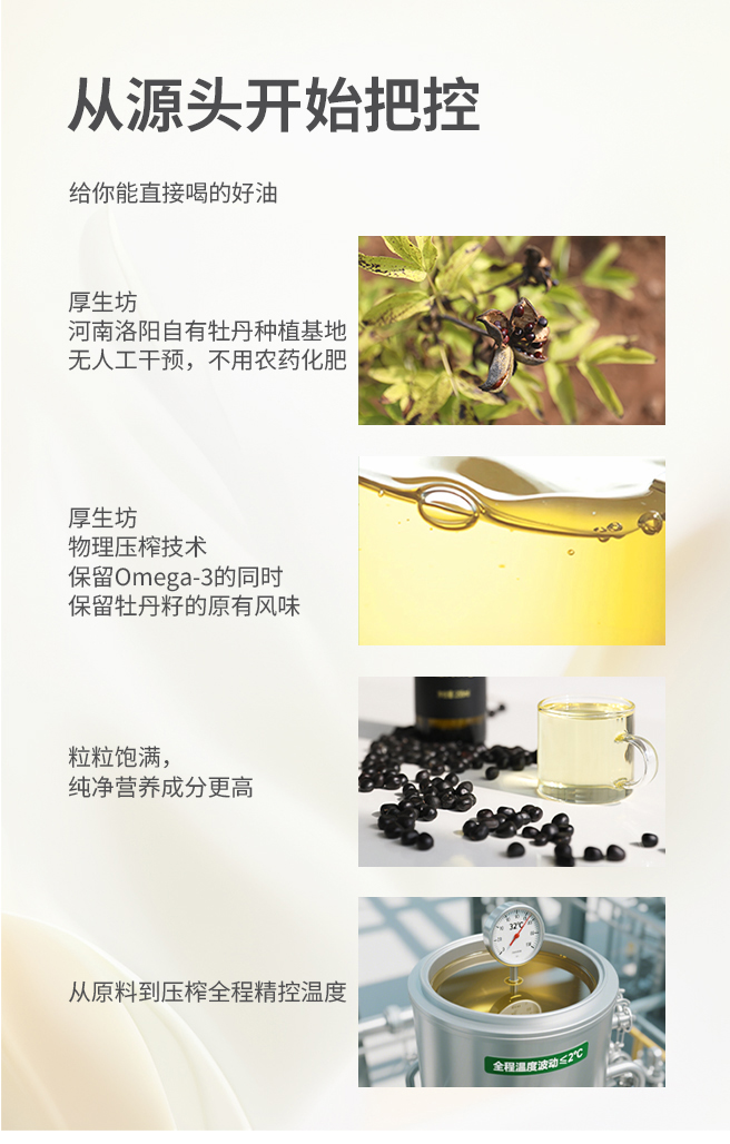 厚生坊牡丹籽油,点亮健康生活。自有种植基地,引进国际先进设备,自主种植+加工+销售三产融合,牡丹籽油不饱和脂肪酸达90%以上,保留牡丹籽纯正的天然营养,为您带来健康的滋养力量。