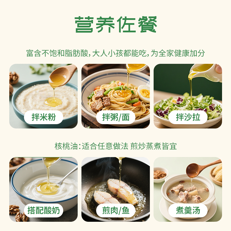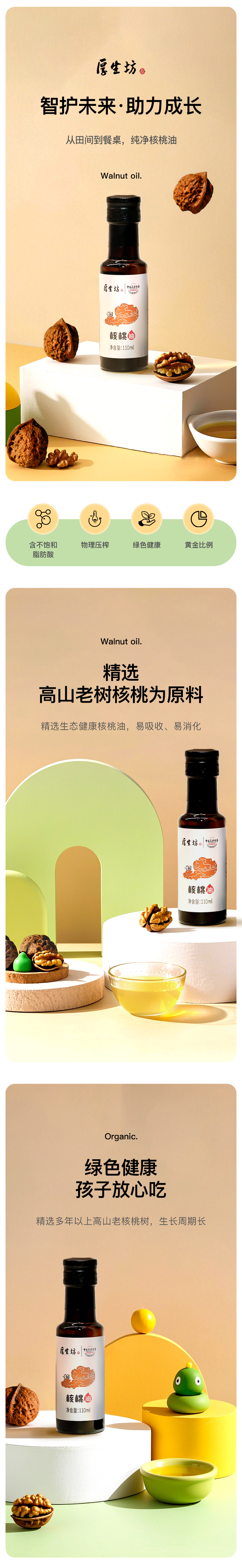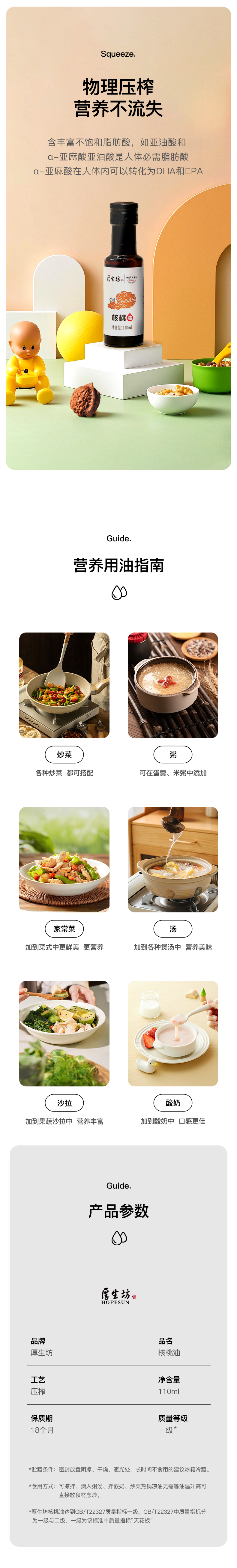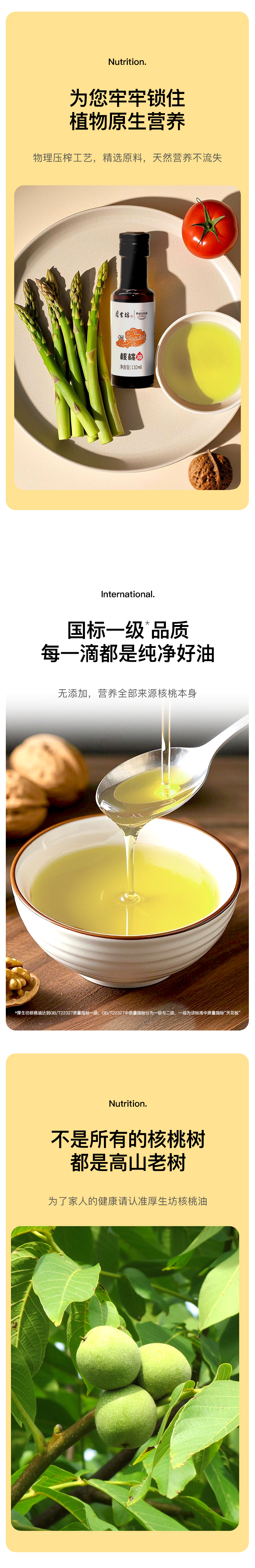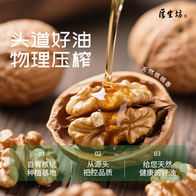 厚生坊核桃油,甄选天然优质核桃。以非凡品质,传递非凡心意。每一滴都蕴含着大自然的营养与健康,只为天然、安全、健康的产品,厚生坊核桃油,守护您的幸福生活。